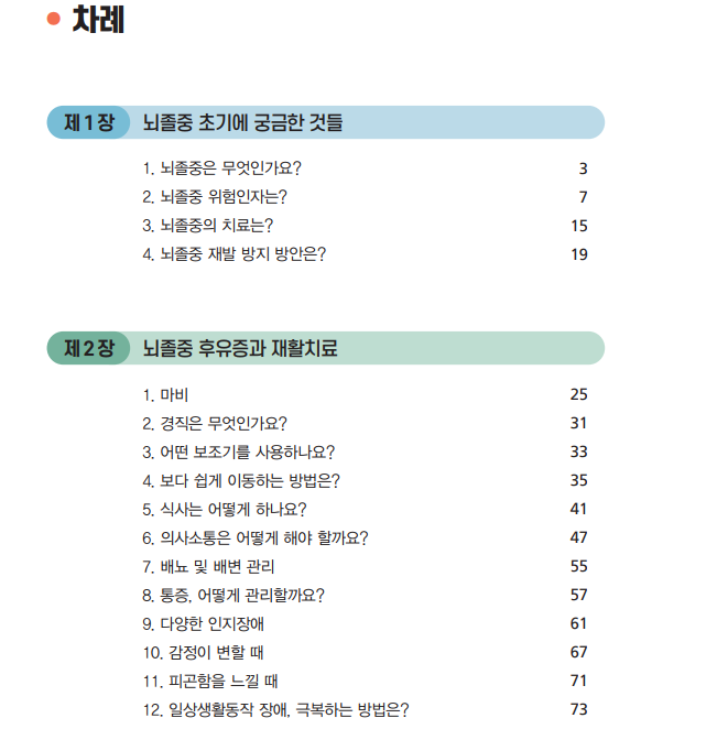 2장에서는 ‘뇌졸중 후유증과 재활치료’ 로 뇌졸중 후유 증상 및 장애, 재활치료 등을 다루었습니다.