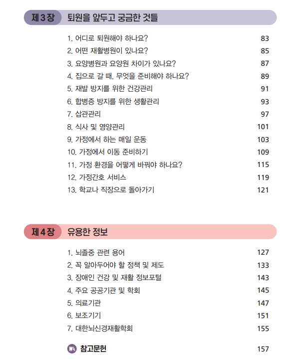 3장에서는 ‘퇴원을 앞두고 궁 금한 것들’로 건강관리, 삽관관리, 가정재활운동, 재활의료 전달체계 등에 대해 자세하게 수록하였습니다.