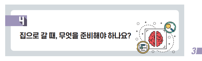 집으로 갈 준비를 하다 보면 준비할 것들 이 너무 많다는 것을 깨닫게 됩니다. 집에서 응급상황이 생기면 어떻게 할까, 앞으로 약은 어떻게 처방받아서 복용할까, 우리 집에 위험한 환경은 없을까, 집 근처 주민센터에 가면 사회복지서 비스에 대해서 상담을 받을 수 있을까… 등등 많은 질문이 떠오르겠지요.