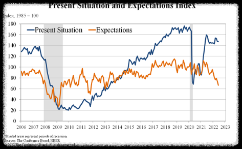 하락의 원인은 거의 10년 만에 최저치를 기록한 기대 지수가 경기 침체의 위험을 증가시켰기 때문입니다.