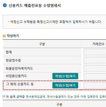 사업용신용카드 외 카드를 사용하여 매출이 있었다면 작성(수정) 하기 눌러서 입력해 주세요.