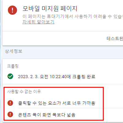 URL을 Google에 등록할 수 있지만 문제가 있다고 합니다. 모바일 미지원페이지라는 결과를 얻었고, 클릭해서 들어갑니다.