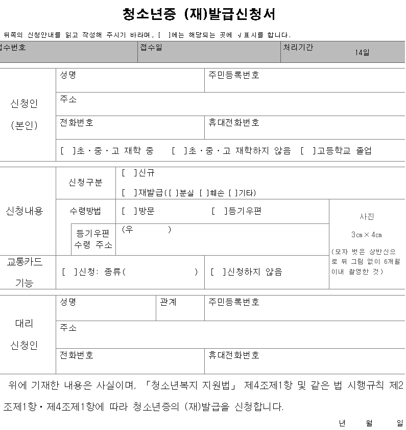 청소년증 발급 신청서 양식