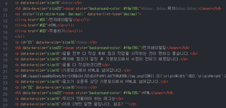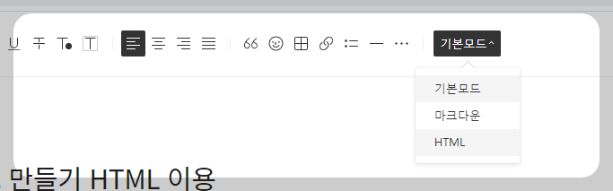 글쓰기 오른쪽 상단 기본모드에서 HTML로 넘어갑니다.